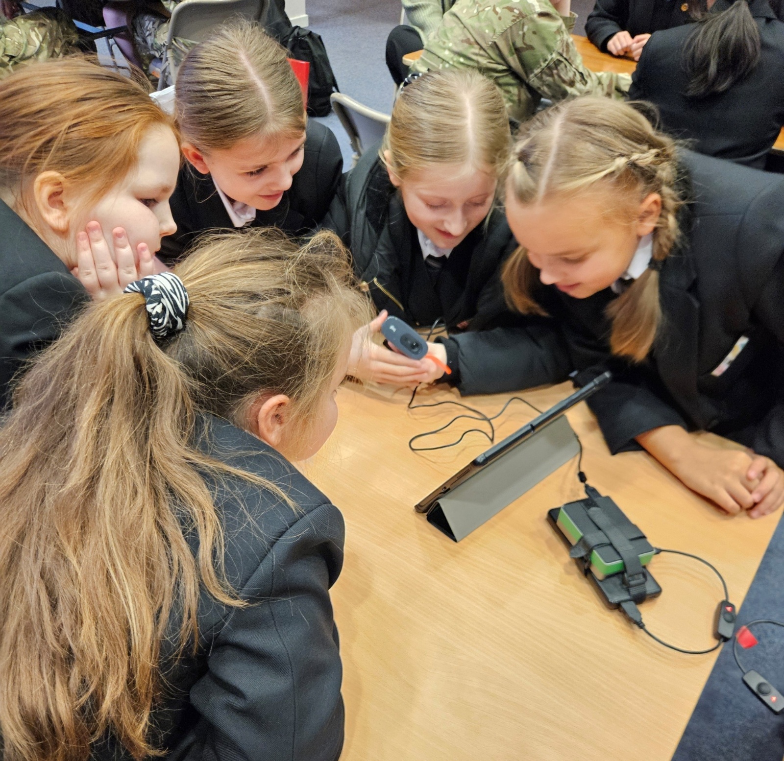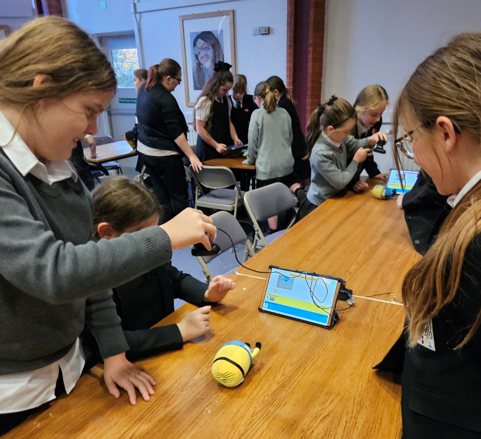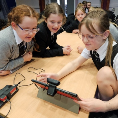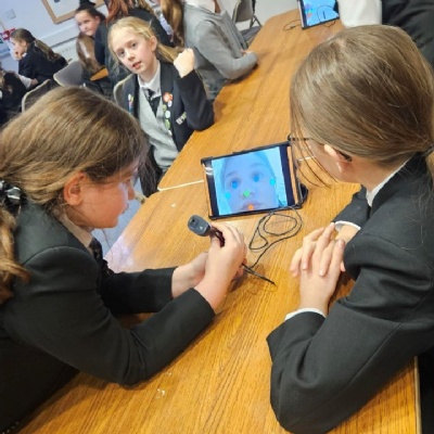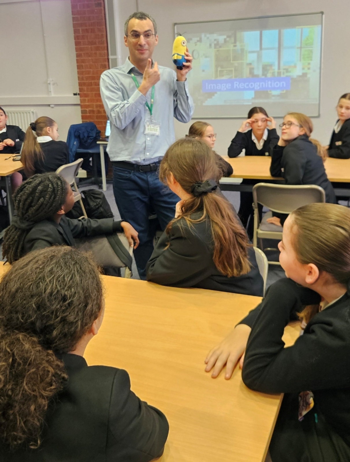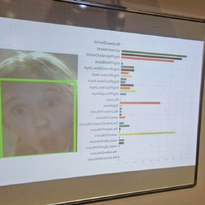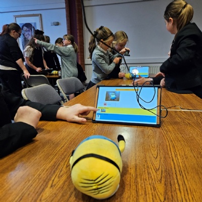 Nick brought along fantastic equipment for each group to use, including tablets, Raspberry Pi computers, and webcams as part of the practical workshops. First they explored the concept of machine learning by training an AI system to recognise the difference between a human and a Minion! They also experimented with object detection and facial mapping/ recognition techniques. Along with machine learning, the students delved into the world of generative AI where they created video and image content and listened to a comparison of AI-generated versus human-created music.