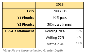Our 2025 attainment shows results in-line with National figures across reading, writing and mathematics, with a pleasing amount of our girls achieving greater depth in reading and maths.